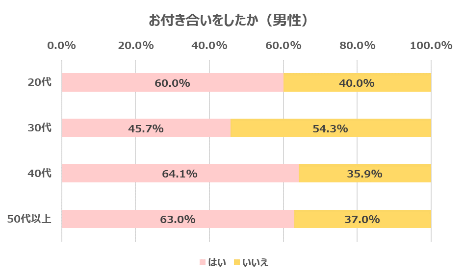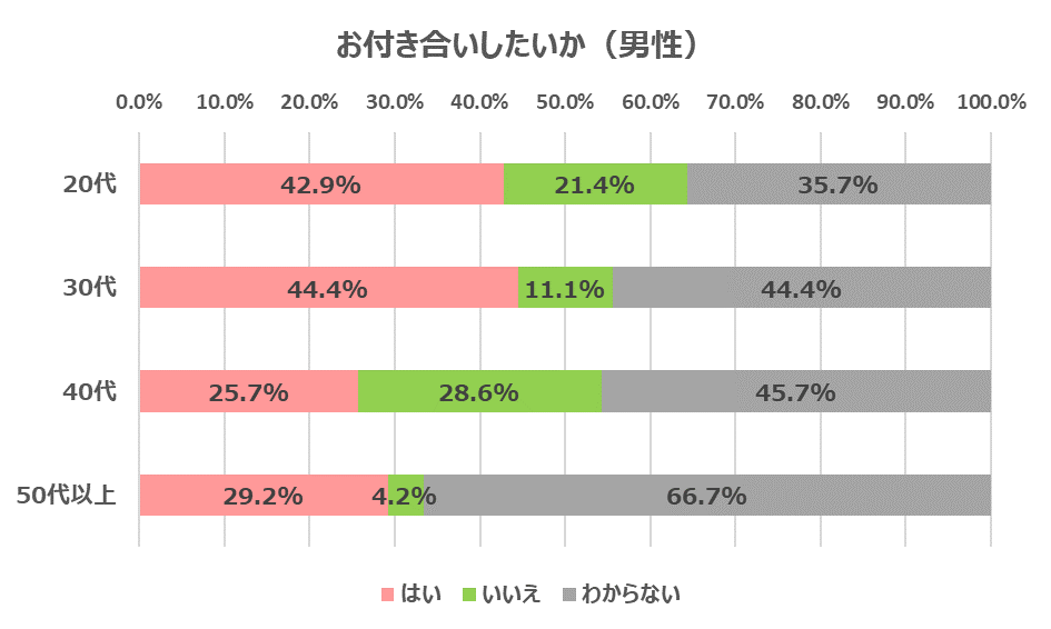 20代・30代の男性は付き合いたいと思っている方が多く、30代は男女で倍以上の差がついています。また女性は50代以上がもっとも多いという結果になりました。