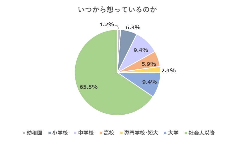 続いていつからその人を想い始めたのか聞いてみたところ、65.5%の人が社会人以降に出会った人であると回答しました。「幼馴染がずっと好きだった」のようなことはドラマやアニメの世界の話なのかもしれません。