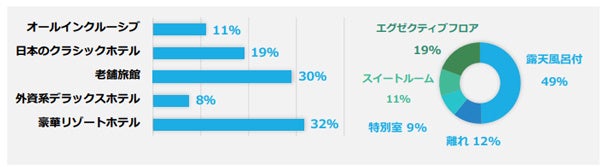 泊まりたい宿泊施設は「豪華リゾートホテル」32%、「老舗旅館」30%と、意外にも「外資系デラックスホテル」は1割未満でした。部屋のタイプは「露天風呂付」と「離れ」と答えた人があわせて6割に上り、プライベートな時間を重視する人が多いことがわかりました。「温泉でゆっくりしたい」、「老舗旅館とはいえ古いだけは困る」「小規模な高級旅館を希望」等の声も寄せられました。