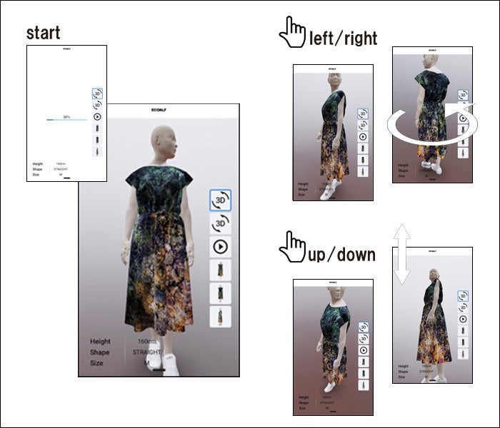 店頭に設置されたタブレット画面上のアバターを通じて、自分の体形やサイズを選びながら着用イメージを操作し、水族表現家の二木あい氏が撮影したカラフルな珊瑚の作品が3DプリントされたECOALF新作ドレスをカスタムオーダーする体験ができます。