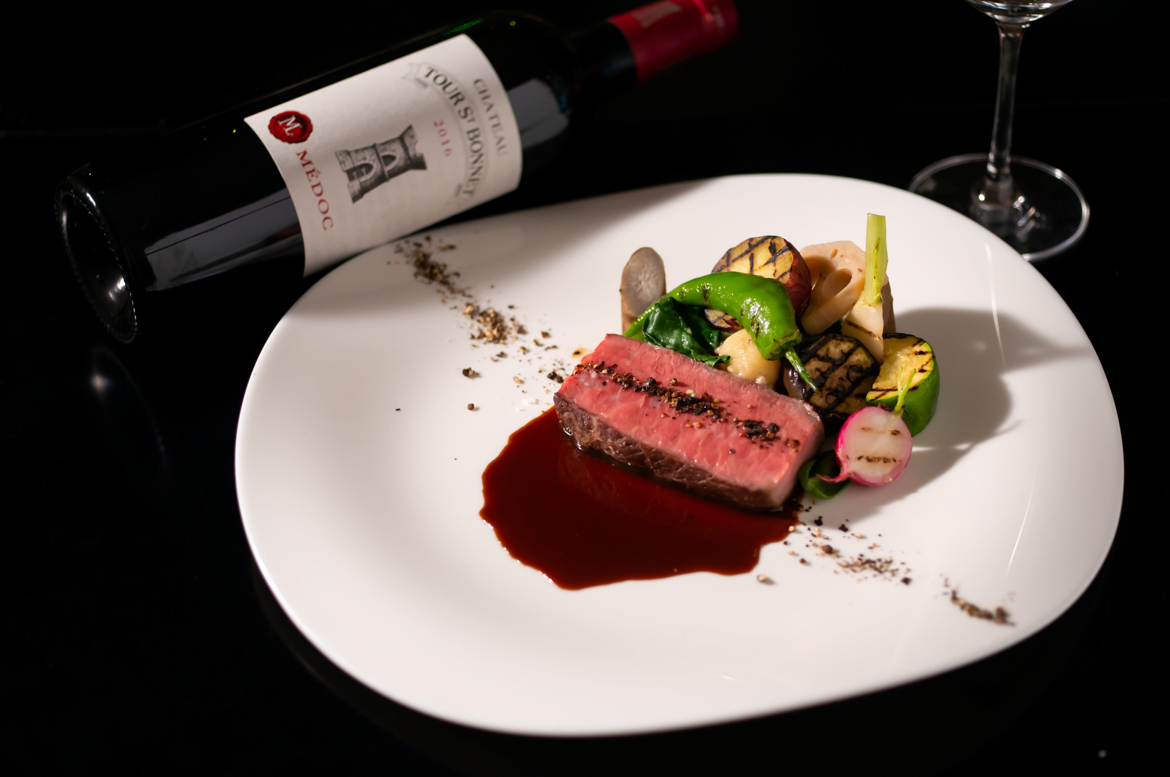 ・宮城登米特産日高見牛サーロインと冬野菜のグリル/トリュフのニョッキ マルサラ酒香る赤ワインソース