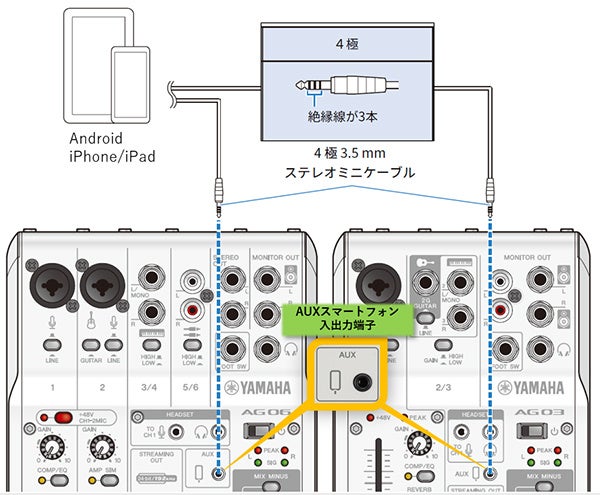 『AG06MK2』『AG03MK2』では、従来のUSB端子によるPC・iPhone・iPadとのデジタル接続に加えて、新たに「AUXスマートフォン入出力端子」によるAndroid OS端末へのアナログ接続*にも対応しました。この「AUXスマートフォン入出力端子」はiPhone・iPadとも、市販の変換アダプタケーブルを使用することでアナログ接続*が可能です。アナログ接続は、USB端子との同時使用もできるので、2つの端末を使用しての同時配信やサブ端末からのゲスト参加など、幅広い用途に活用できます。