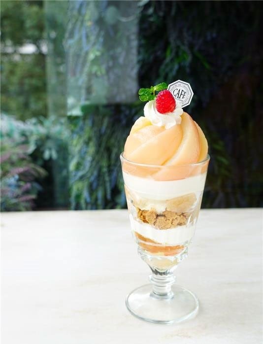 *軽井沢店では、白桃、ヴァーベナゼリー・バニラアイスクリーム・ホイップクリーム・グラノーラが入った「ピーチのヴァーベナパフェ」を1,680円で提供しております。