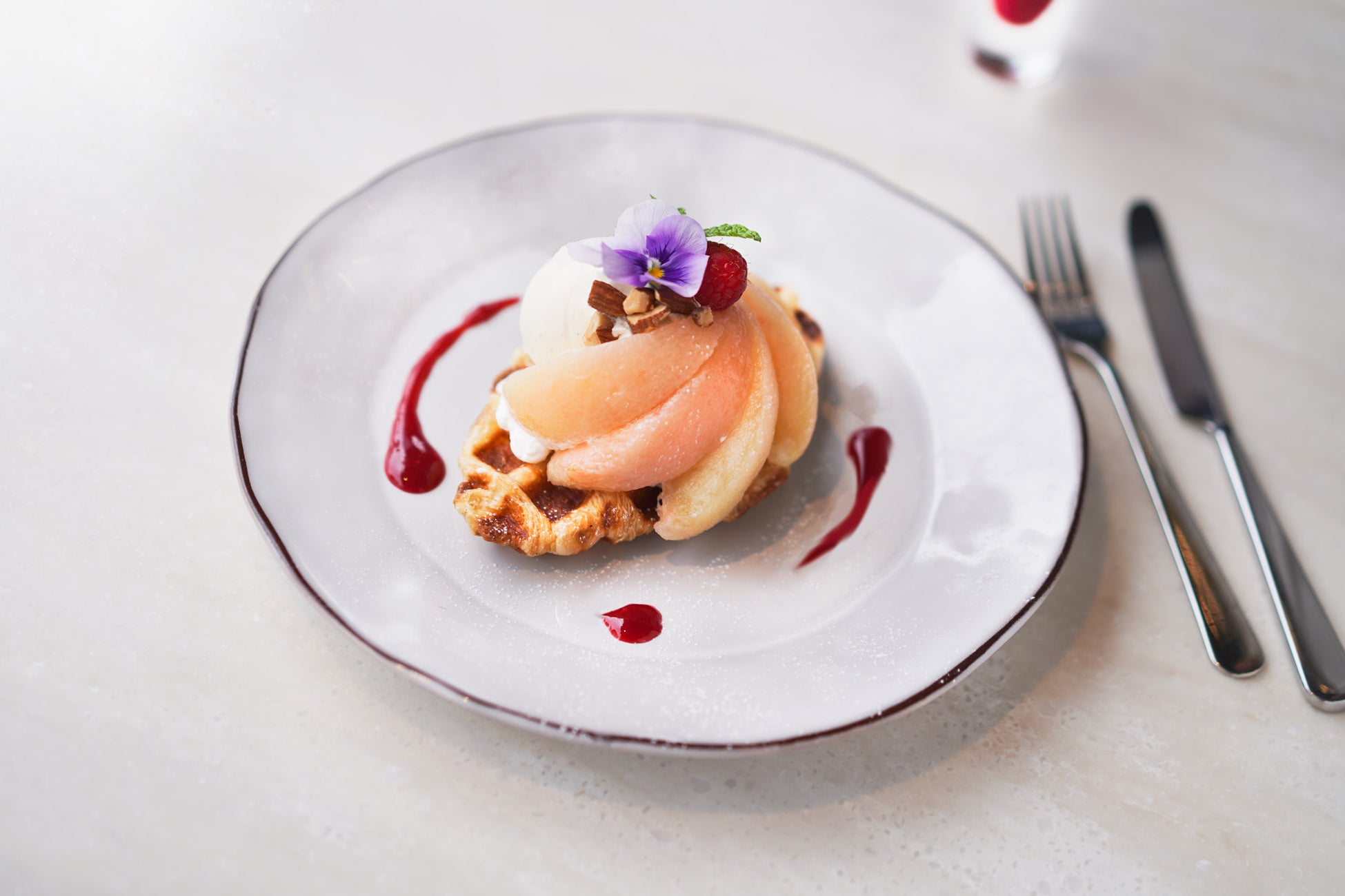 同じく限定登場するのは、「クロワッサンワッフル ピーチ&バニラ」。発酵バター香るクロワッサンワッフルにホイップを絞り、旬の白桃コンポート・バニラアイスクリームをあわせ、最後にラズベリーソースをかけていただく季節限定メニュー。ワッフルの香ばしさと、フルーツのジューシーな甘みが織りなすハーモニーをお楽しみいただけます。