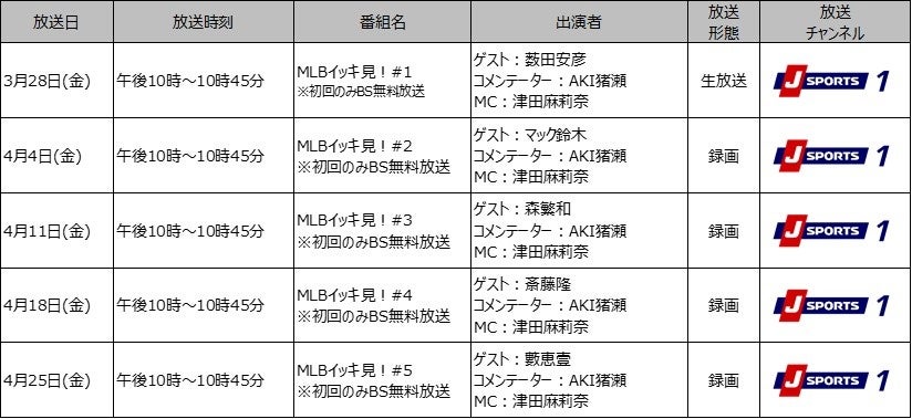 そして、アメリカ開幕日の3月28日(金)からは、 MLBの魅力を発信するMLB情報番組「MLBイッキ見!」を毎週金曜日の午後10 時より初回BS無料放送 (※4) でお届けいたします。MLBアナリスト・ AKI 猪瀬氏と MC ・津田麻莉奈さんが 1週間に起こった出来事、スーパープレーなど、MLBの最新情報をどこよりも分かりやすくお伝えします。