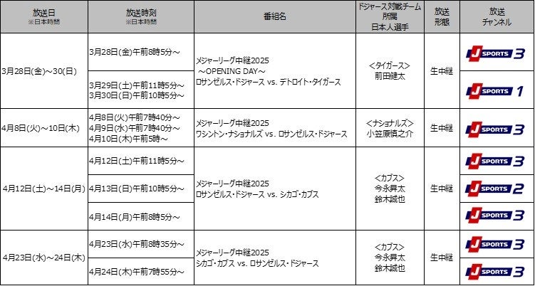 スポーツテレビ局、株式会社ジェイ・スポーツ(本社 東京都江東区、代表取締役社長 長谷一郎、以下「J SPORTS」 ※1)は、日本時間2025年3月28日(金)にアメリカでの開幕を迎える「メジャーリーグベースボール (MLB)2025」を2025シーズンも年間200試合以上を連日放送します。ロサンゼルス・ドジャース大谷翔平選手・山本由伸投手・佐々木朗希投手の先発出場試合を全試合放送(※2) 、その他日本人注目選手の先発出場試合も放送予定です。 (※3)