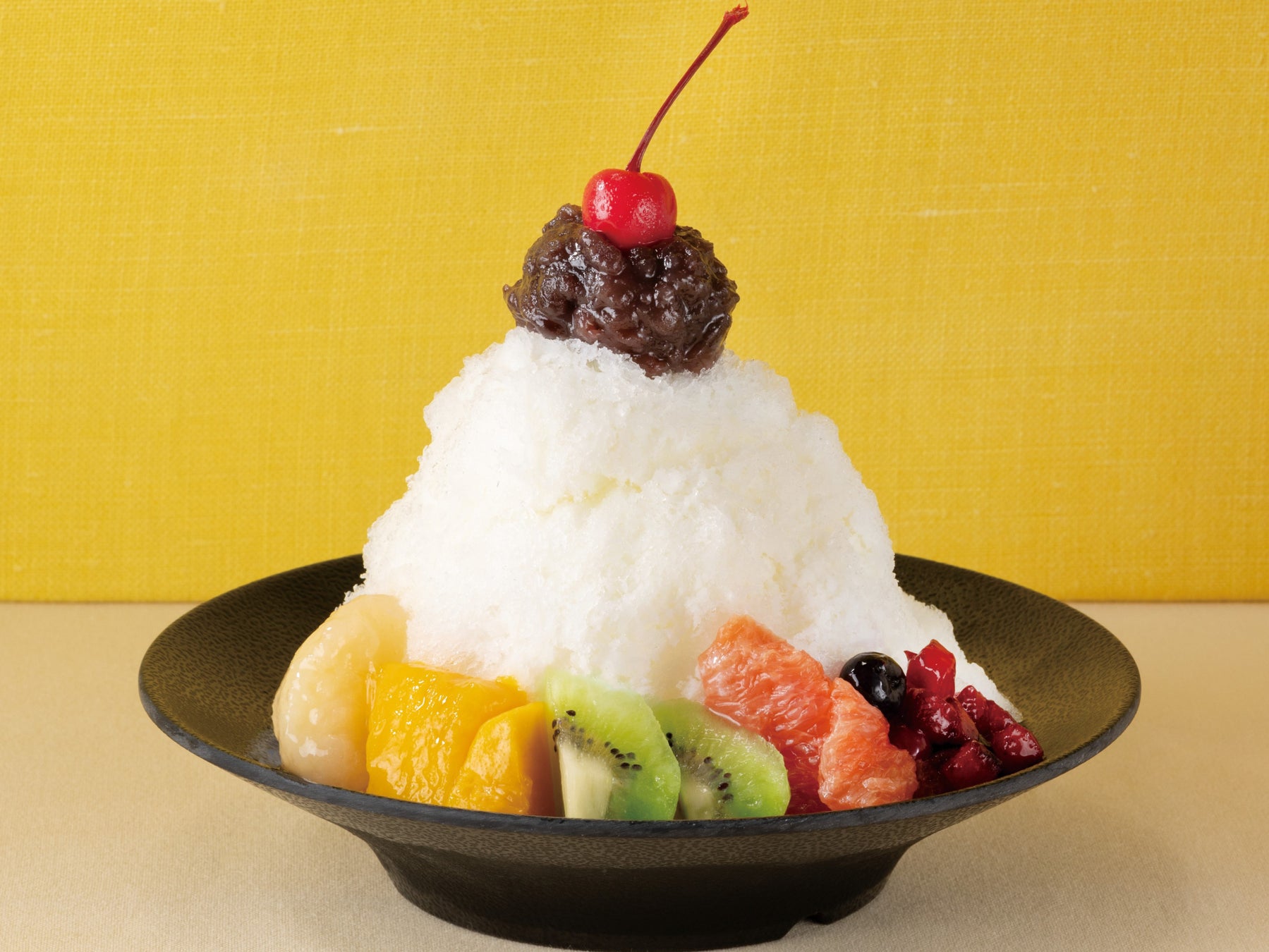 濃厚な練乳シロップのかき氷に色々なフルーツをのせた、しろくま風かき氷です。小倉あんの落ち着いた甘みと、フルーツの酸味、ミルキーな練乳のコクが合わさった贅沢な味わいです。