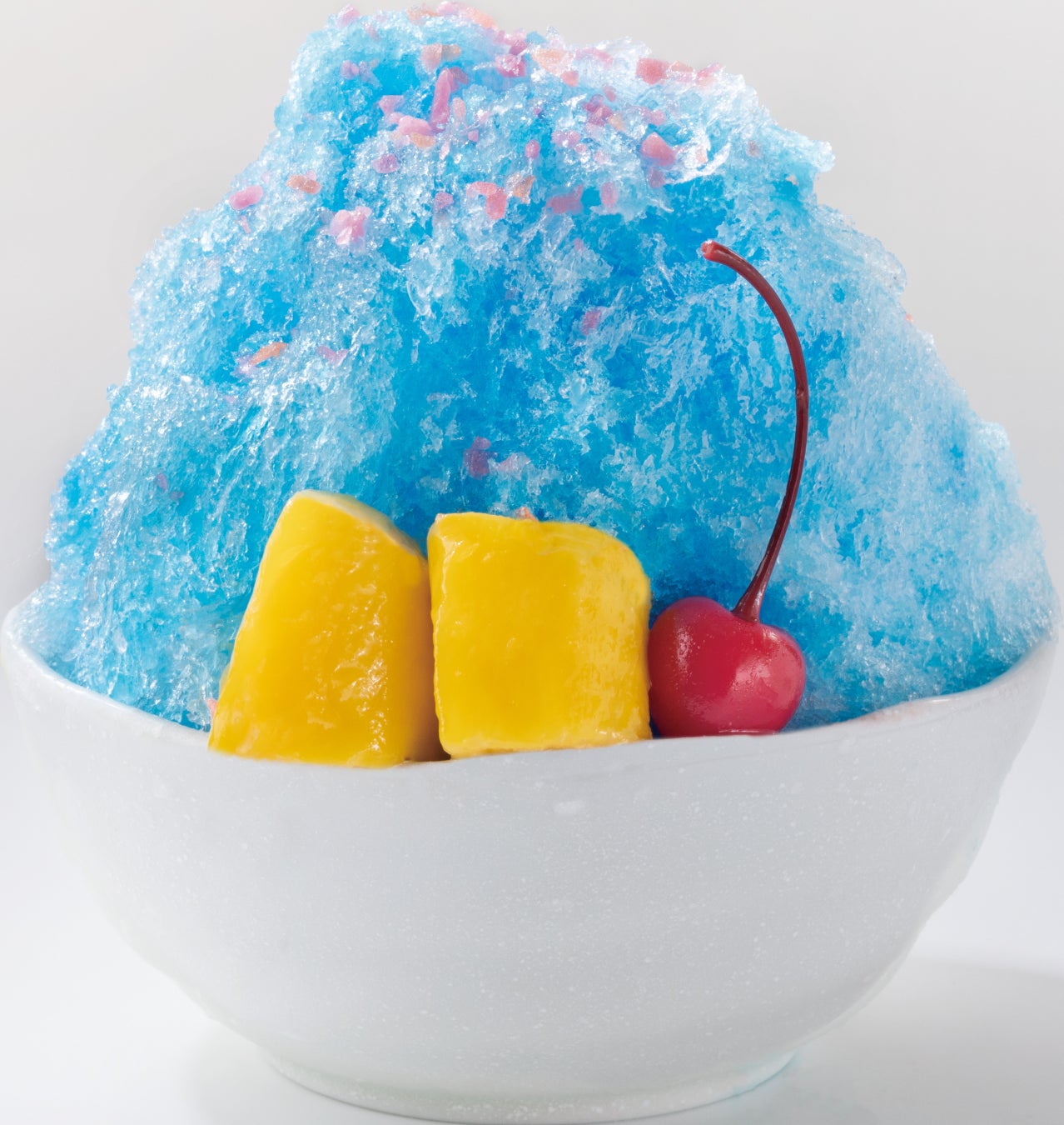 色鮮やかで夏にぴったり!マンゴーとさくらんぼがのった定番のブルーハワイです。別添えのパチパチアメ(いちご味)をかけたら、はじける食感や音も楽しめる爽やかな一品です。