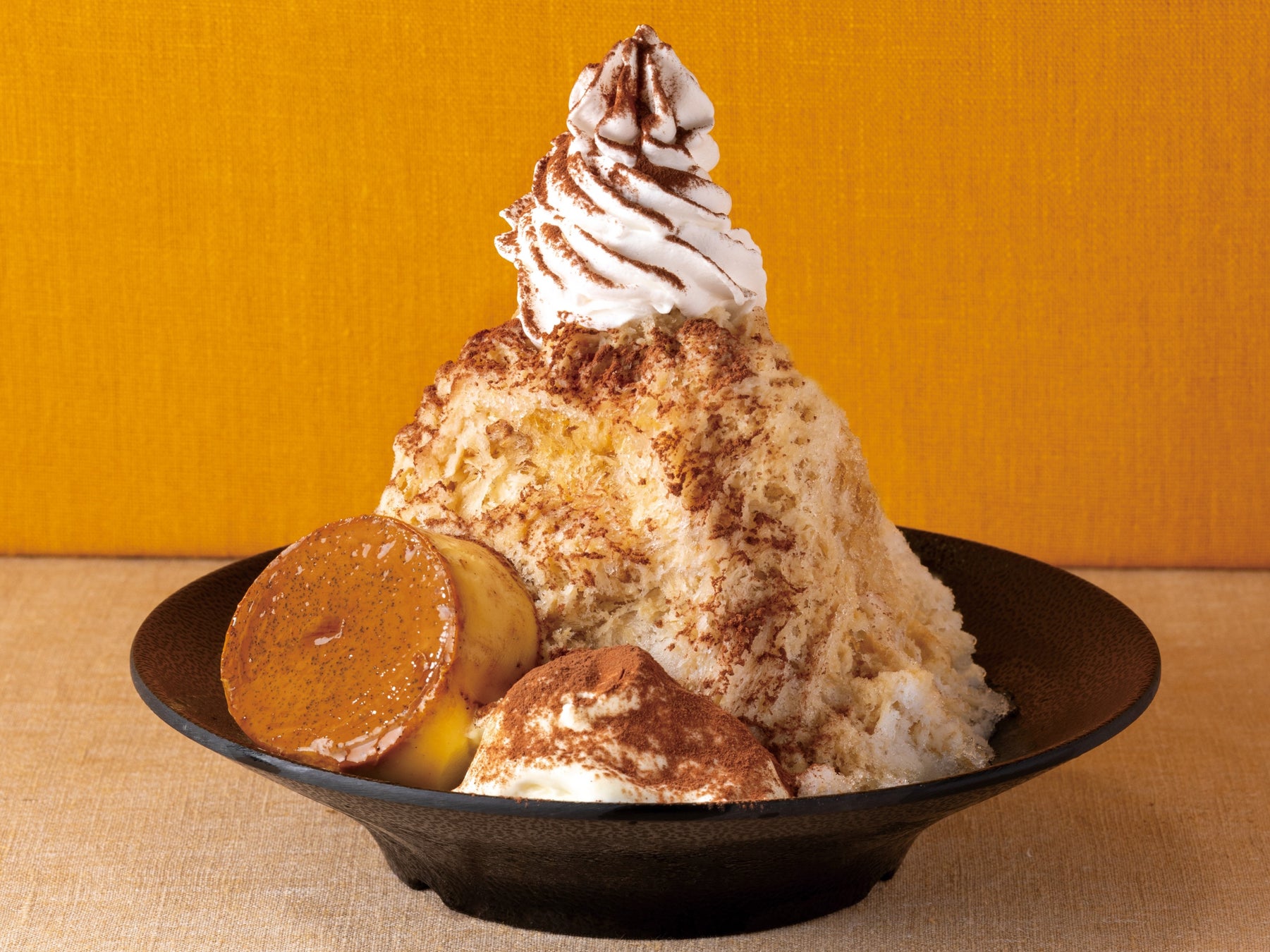 人気の自家製プリンまるごと1個とマスカルポーネクリームをのせました。ほろ苦いコーヒーシロップと練乳シロップが合わさると、カフェラテ風に。ちょっぴり大人な味わいを楽しめます。