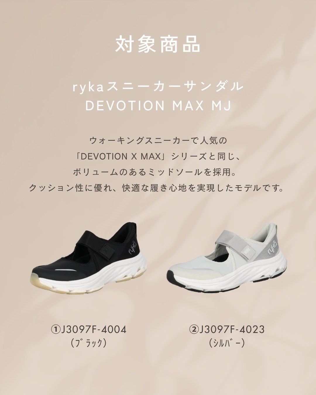 ryka公式インスタグラムアカウント(@ryka.jp)のフォロワー様限定企画で、ウォーキングスニーカーで人気の【DEVOTION X MAX】シリーズと同じボリュームのあるミッドソールを採用し、クッション性、快適な履き心地を実現したスニーカーサンダル【DEVOTION MAX MJ】を抽選で合計2名様にプレゼントいたします。