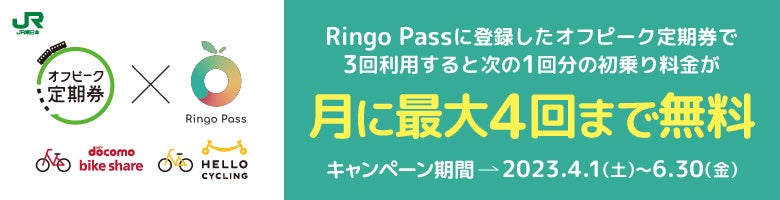 JR東日本は、1つのアプリでシェアサイクルやタクシーなど複数の交通手段をスムーズにご利用いただけるRingo Passを提供しています。このたび「オフピーク定期券」のサービス開始に合わせ、「オフピーク定期券」をご利用で、Ringo Passに登録された方を対象に、シェアサイクルご利用時の特典をプレゼントするキャンペーンを実施します。この機会に、シェアサイクルをぜひご体験ください。