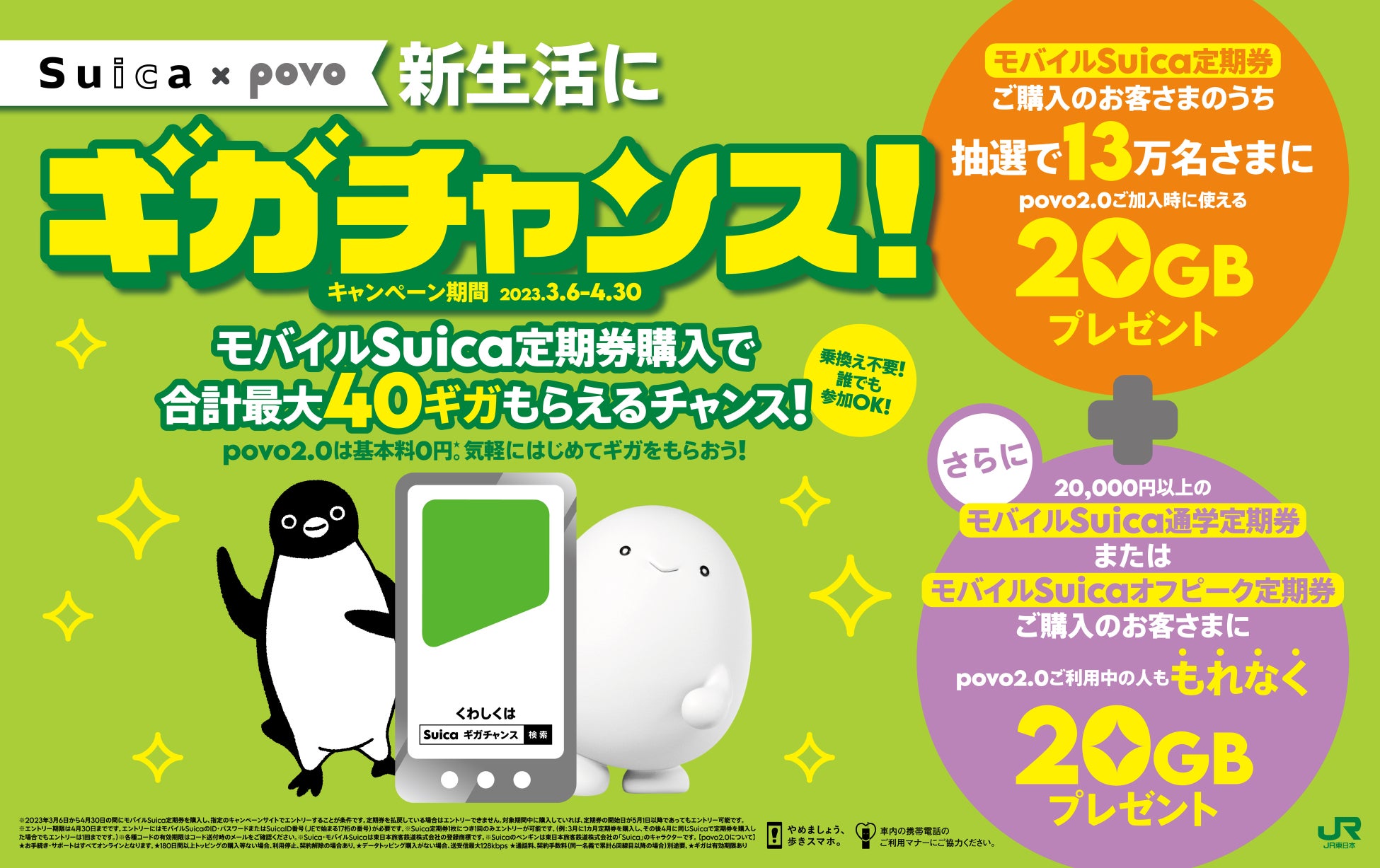 2023年3月6日からKDDI株式会社と連携する「新生活にギガチャンス!」キャンペーンの一環として、2023年3月18日から4月30日までの間に20,000円以上の「オフピーク定期券」をモバイルSuicaで購入し、指定のサイトでエントリーいただいた方には、もれなく「povo」の通信容量20GBをプレゼントします。抽選でさらに20GBをプレゼントします(合計最大40GB)。