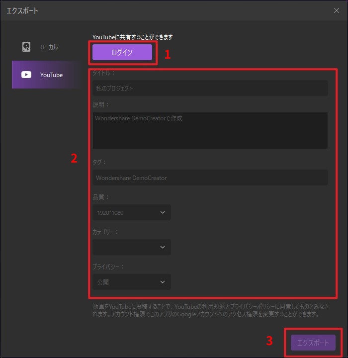 DemoCreatorで作成した動画をMP4、MOV、MP3、GIFなど様々な形式で素早く保存できます。エンコーダー、解像度、フレームレート、ビットレートなどの細かい設定も簡単にできます。さらに、YouTubeアカウントでサインインすれば、直接YouTubeに動画をアップロードすることも可能です。