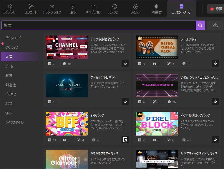 DemoCreatorには、動画のカット、クロップ、スピード変更などの編集機能はもちろん、グリーンスクリーン、ステッカー、トランジションなどのエフェクト素材も豊富に搭載しています。エフェクトストアでは、DemoCreatorで使えるクリエイティブなエフェクト素材を続々追加しています。テーマ別に用意されたエフェクトパックは、チュートリアル動画、ビジネスプレゼンテーション、ゲーム実況動画、Vlogなど様々なシーンでの動画編集に適しています。録画した動画は即座にライブラリーにインポートされ、豊富な編集機能とエフェクトをお好きに組み合わせることで、動画の魅力を一気にアップさせることができます。