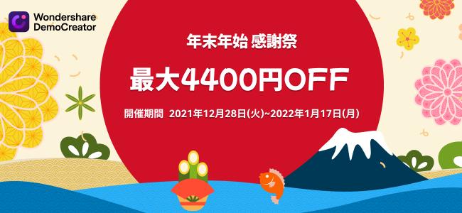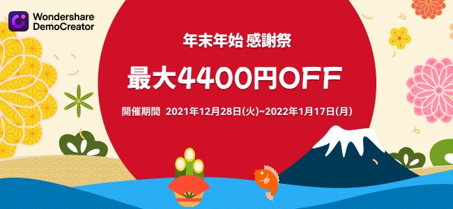 世界150か国以上で利用されるソフトウェアを手掛ける、株式会社ワンダーシェアーソフトウェア(東京都千代田区、代表:呉太兵)は、誰でも簡単に使える画面録画・動画編集ソフトWondershare DemoCreator(ワンダーシェアー デモクリエイター)が、2021年12月28日(火)~2022年1月17日(月)まで、最大4,400円OFFになる年末年始感謝祭を実施いたします。