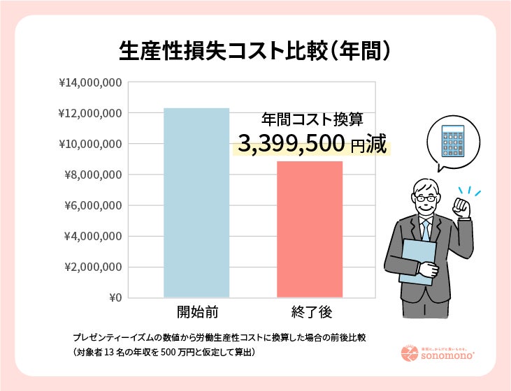 プレゼンティーイズムの改善率5.23%を労働生産性コストとして試算した結果、対象者13名、年収500万円のケースでは、月間283,292円、年間3,399,500円の損失削減が見込まれることが分かりました。