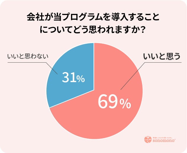 「会社が健康管理の取り組みとして本プログラムを導入することについてどう思われますか?」の設問には、69%が「いいと思う」と回答。その中で「とてもいいと思う」の理由として、「健康や腸活が仕事の生産性に直結する」という声が多く挙げられました。他にも、「自身の腸活に向き合うきっかけになることで健康意識につながる」「手軽に健康への取り組みができる」という回答が得られました。一方「いいと思わない」と回答した人は「効果を感じられなかった」という回答でした。
