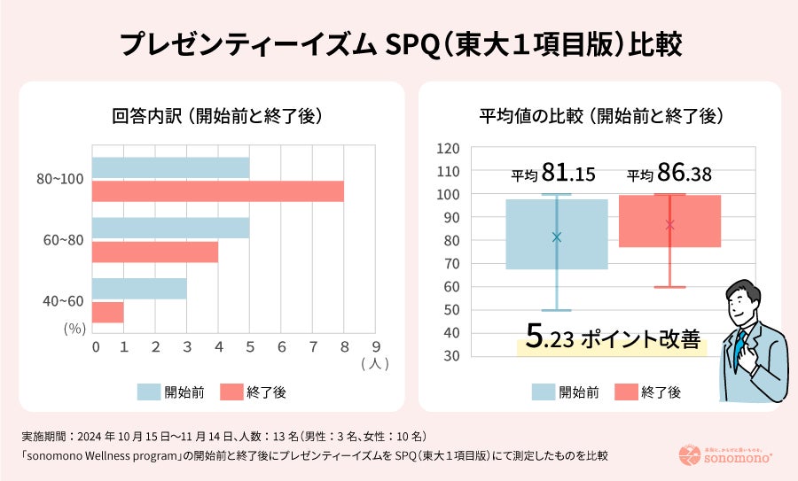 さらに、今回の実施では、プログラム開始前後のアンケートを活用し、プレゼンティーイズム(出勤しているものの生産性が低下している状態)の評価を行いました。その結果、生産性を数値化することで、これまで見えにくかった損失コストを「見える化」することができました。この分析結果は、企業の経営指標としても非常に有益であり、従業員の健康が企業全体のパフォーマンス向上に直結することを改めて実感しました。