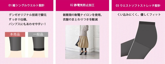本商品はグンゼオリジナル技術で、裾がシングルヘムになっており、従来のダブルヘムと比べてカジュアルになりすぎず、すっきり見えるため、きれいめファッションにもぴったりのレギンスです。レッグ部は吸湿発熱機能、パンティ部は内側パイル仕様で秋冬に嬉しいあったか機能が満載。静電気防止加工も付加することで、気になるまとわりつきを軽減しました。スカートやシューズとも合わせやすい定番の4色をラインアップ。