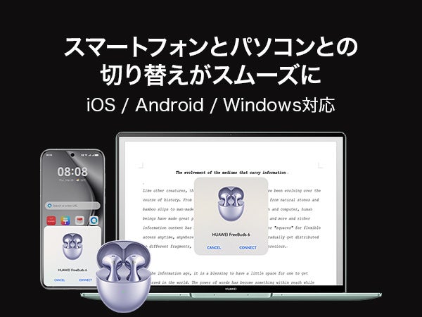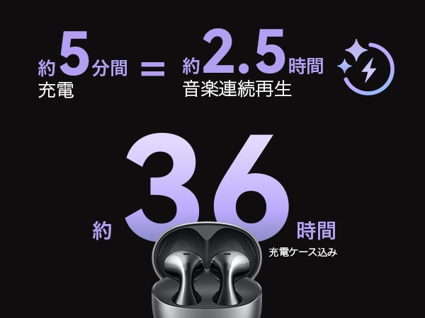 『HUAWEI FreeBuds 6』は、イヤホン単体で最大4.5 時間(ANCあり)または最大6時間(ANCなし)、充電ケースと組み合わせれば最大36 時間の音楽連続再生が可能です。