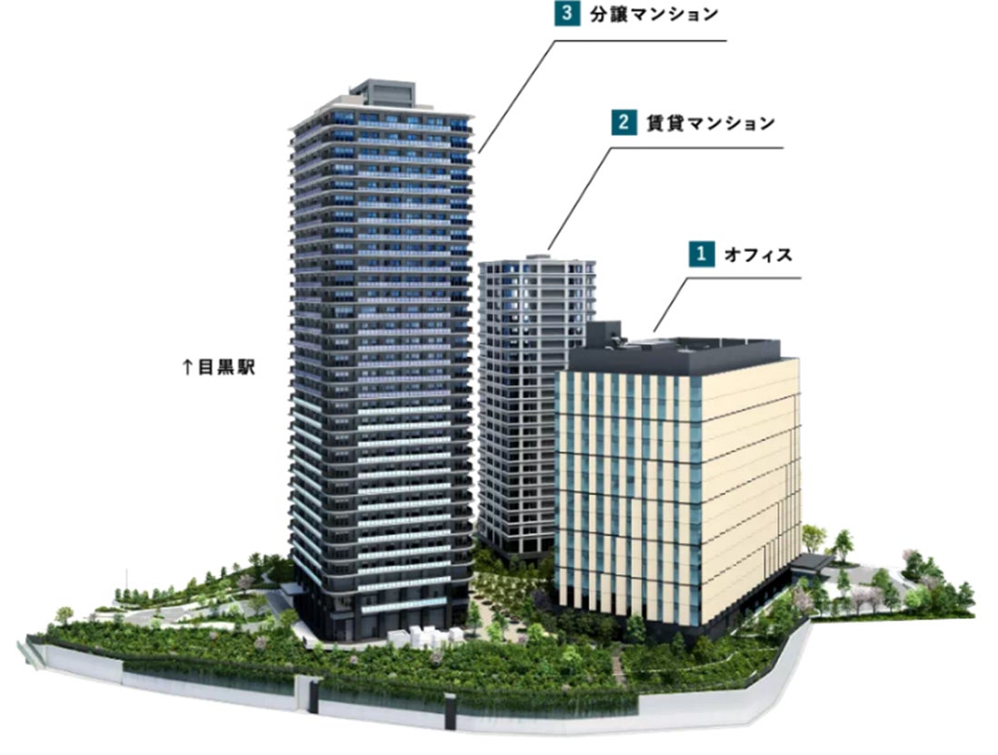 2023年10月16日に分譲住宅「プラウドタワー目黒MARC」の竣工を受け、3棟すべてが完成、職と住のまちににぎわいが増してきました。
