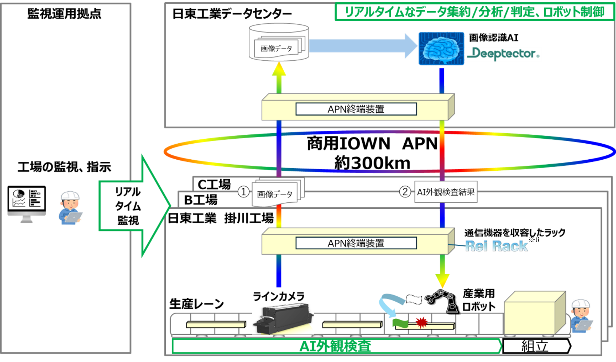 こうした中、日東工業、NTT西日本、NTTドコモビジネスは、「大容量・低遅延・ゆらぎゼロ」を特長とするIOWN APNを用いてデータセンターと工場を接続し、画像解析可能なAI基盤を工場外のデータセンターに集約する遠隔からのAI外観検査の有効性を検証しました。