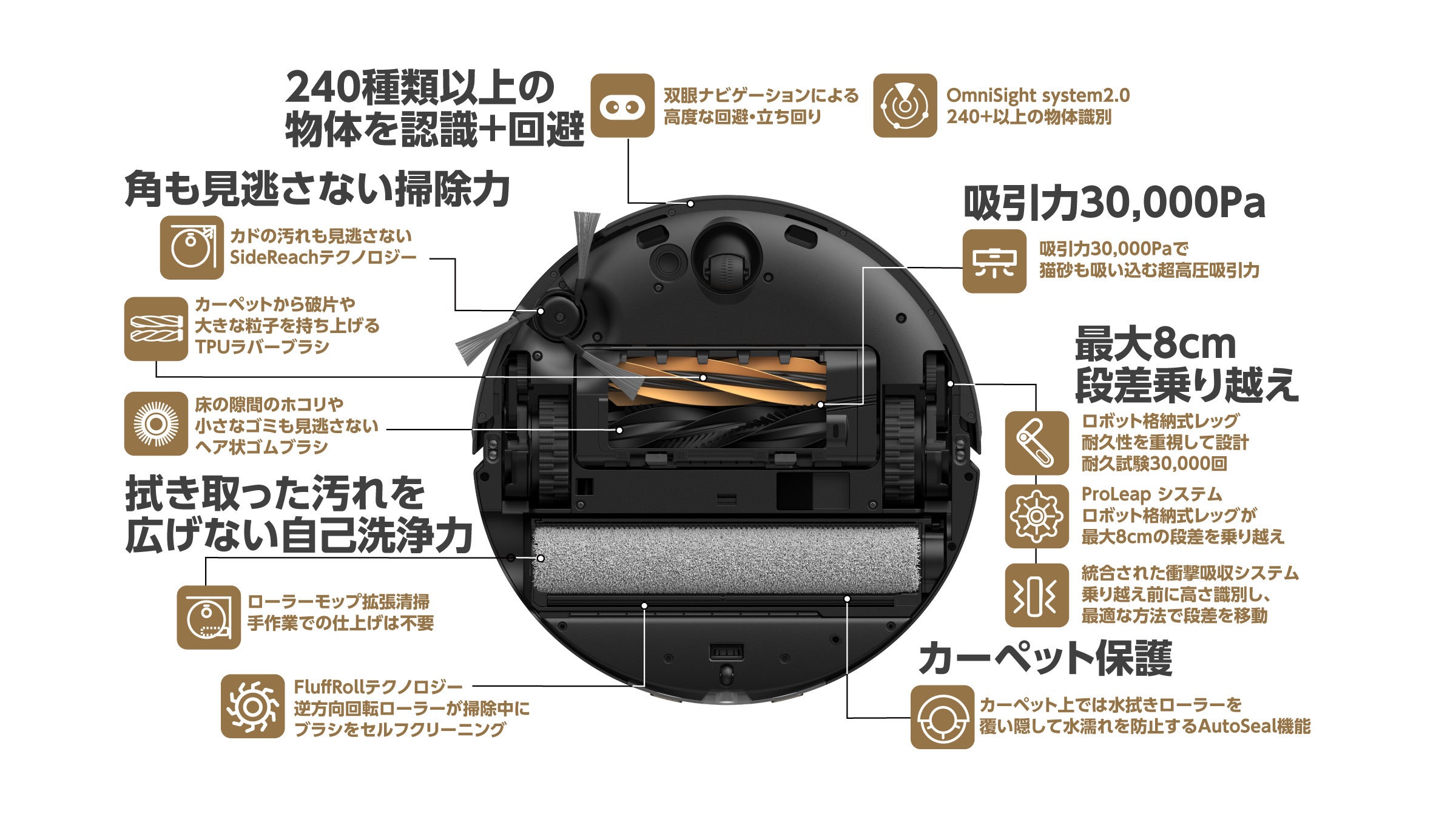 Dreame Aqua10 Ultra Rollerは、ローラー式の濡れモップ、最大8cmの段差を越えられる折りたたみ式の脚、最大30,000Paの吸引力など、ロボット掃除機の常識を変える革新的な機能を多数搭載しています。また、高い障害物回避力や本体、ベースステーションの自動洗浄、モップをスライドして壁際まで掃除できる機能、髪の毛などの絡まりを解消する特殊ブラシなども備えています。