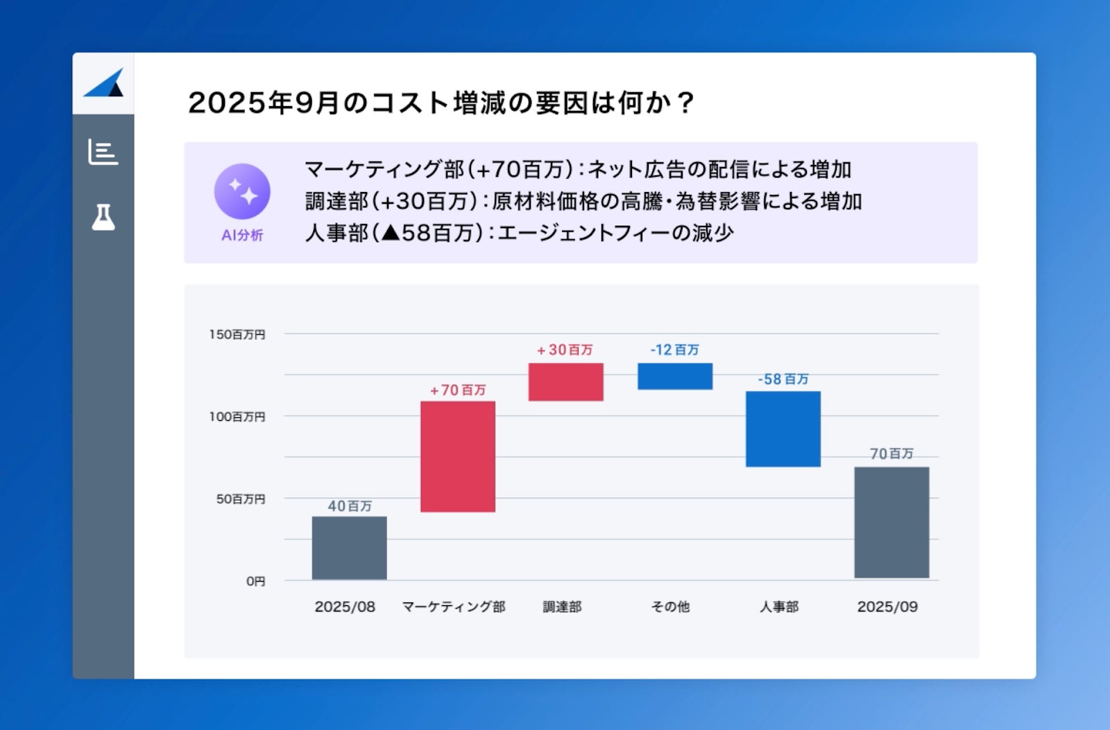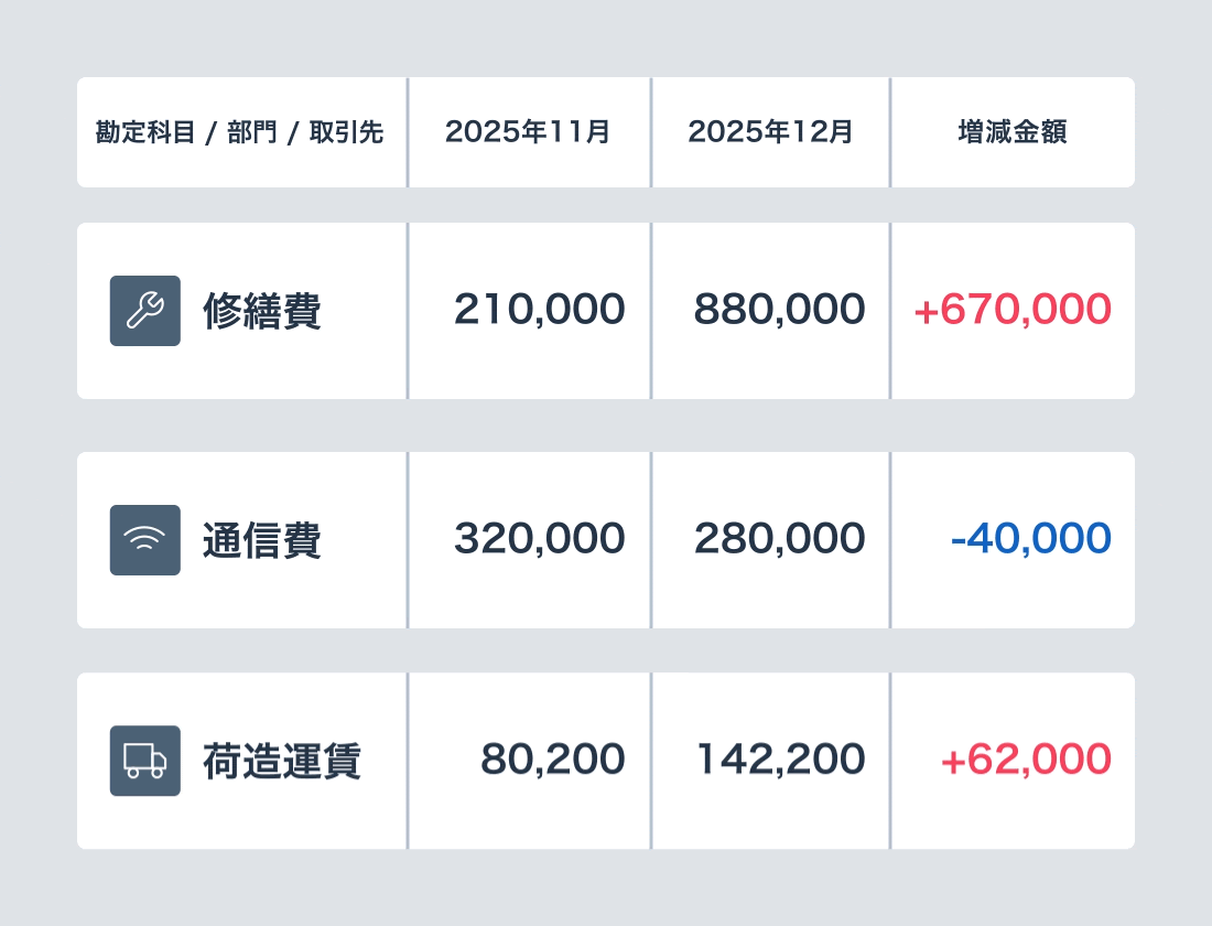 1. コスト変動要因を可視化、集計作業をゼロに。AIが仕訳の詳細分析をサポート。