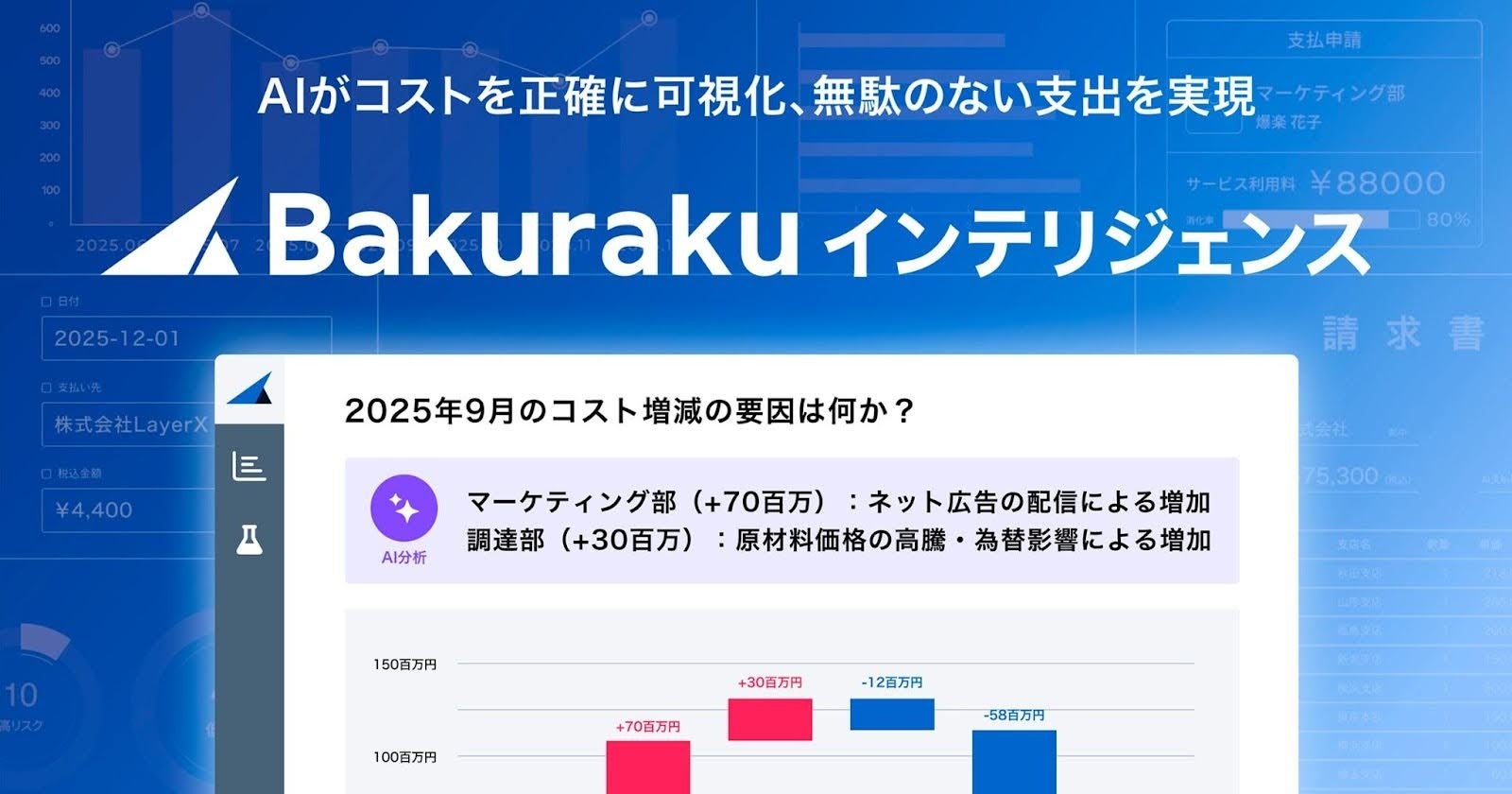 株式会社LayerX(本社:東京都中央区、代表取締役CEO:福島良典、以下 「LayerX」)は、バックオフィス向けAIクラウドサービス「バクラク請求書受取やバクラク経費精算」に蓄積されたデータを活用し、AIによる分析・可視化を実現する新製品「バクラクインテリジェンス」の提供を開始します。