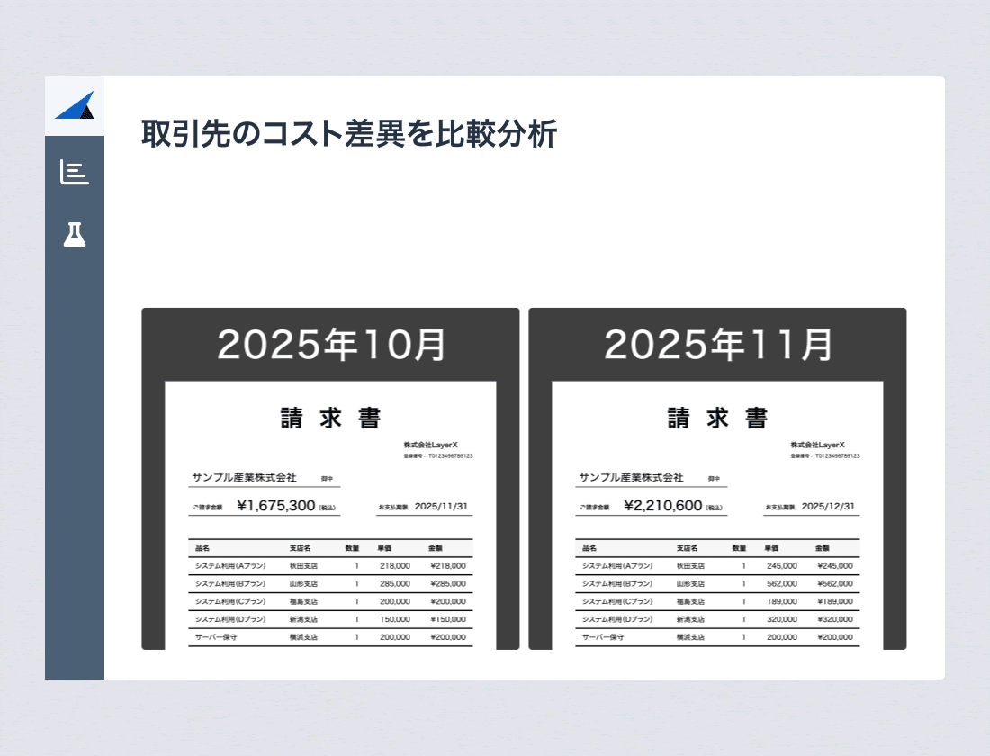 気になる項目をクリックするだけで、金額に差異がある2つの請求書を同一画面で瞬時に表示し、「数量が増えたのか」「単価が上がったのか」といった変動要因をAIが提示します。分析結果の確認のために証憑を別システムで探して突合確認する必要がなくなり、月次決算のチェック業務や監査対応の工数を大幅に削減します。
