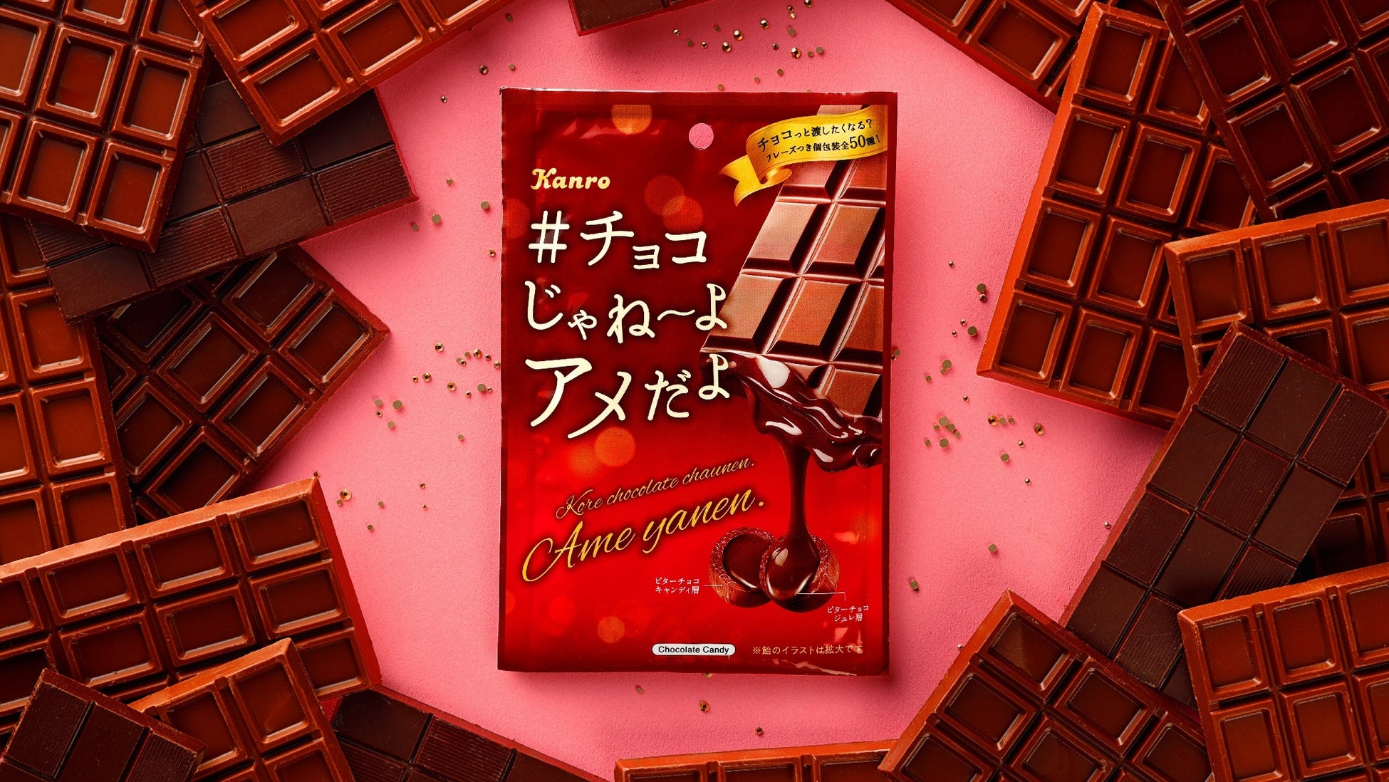 「#チョコじゃねーよアメだよ」は、“バレンタインなのにチョコじゃなくてアメ!? バレンタインに渡せるチョコっとプレゼント”がコンセプトの商品です。「長時間、口に飴を入れていることがストレス」という学生の意見をもとに、ひと粒で飽きてしまわないよう、ビターチョコキャンディの中に濃厚なビターチョコジュレを入れ2層構造にすることで、食感や味わいに変化を持たせているのが特徴です。