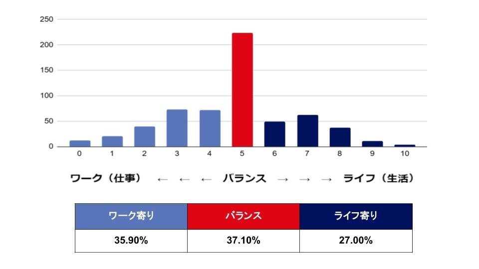 仕事(ワーク)と生活(ライフ)のバランスについて、0~10の11段階で評価したところ(数値が小さいほど仕事の比重が大きく、数値が大きいほど生活の比重が大きい)、「5」(バランスが取れている)と回答した割合が最も多く37.1%、次いで「ワーク寄り」が35.9%という結果になりました。これにより、多くの従業員が一定のバランスを感じている一方で、仕事の比重が高いと感じている従業員も同程度存在していることが分かります。