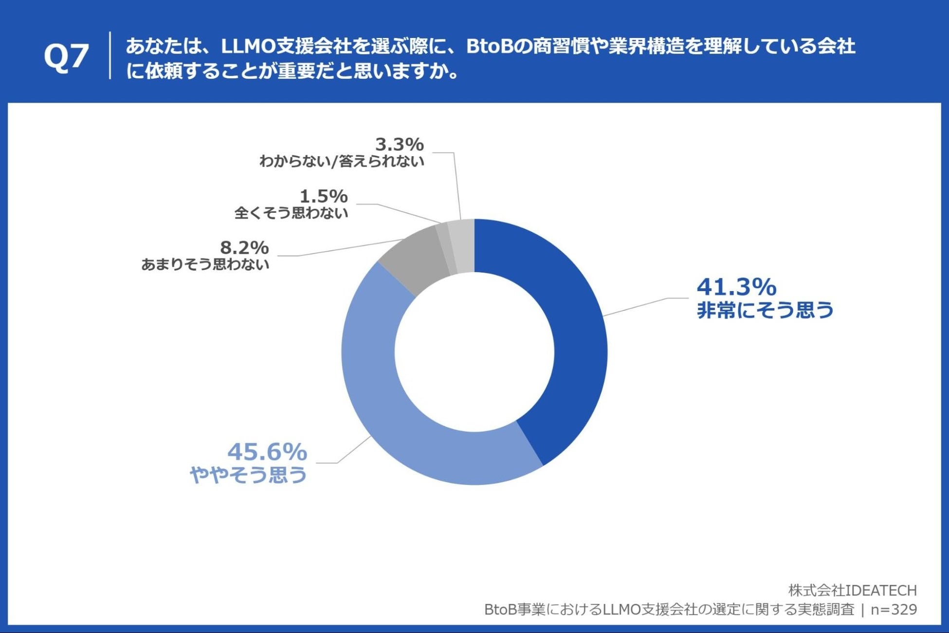 「Q7. あなたは、LLMO支援会社を選ぶ際に、BtoBの商習慣や業界構造を理解している会社に依頼することが重要だと思いますか。」(n=329)と質問したところ、「非常にそう思う」が41.3%、「ややそう思う」が45.6%という回答となりました。