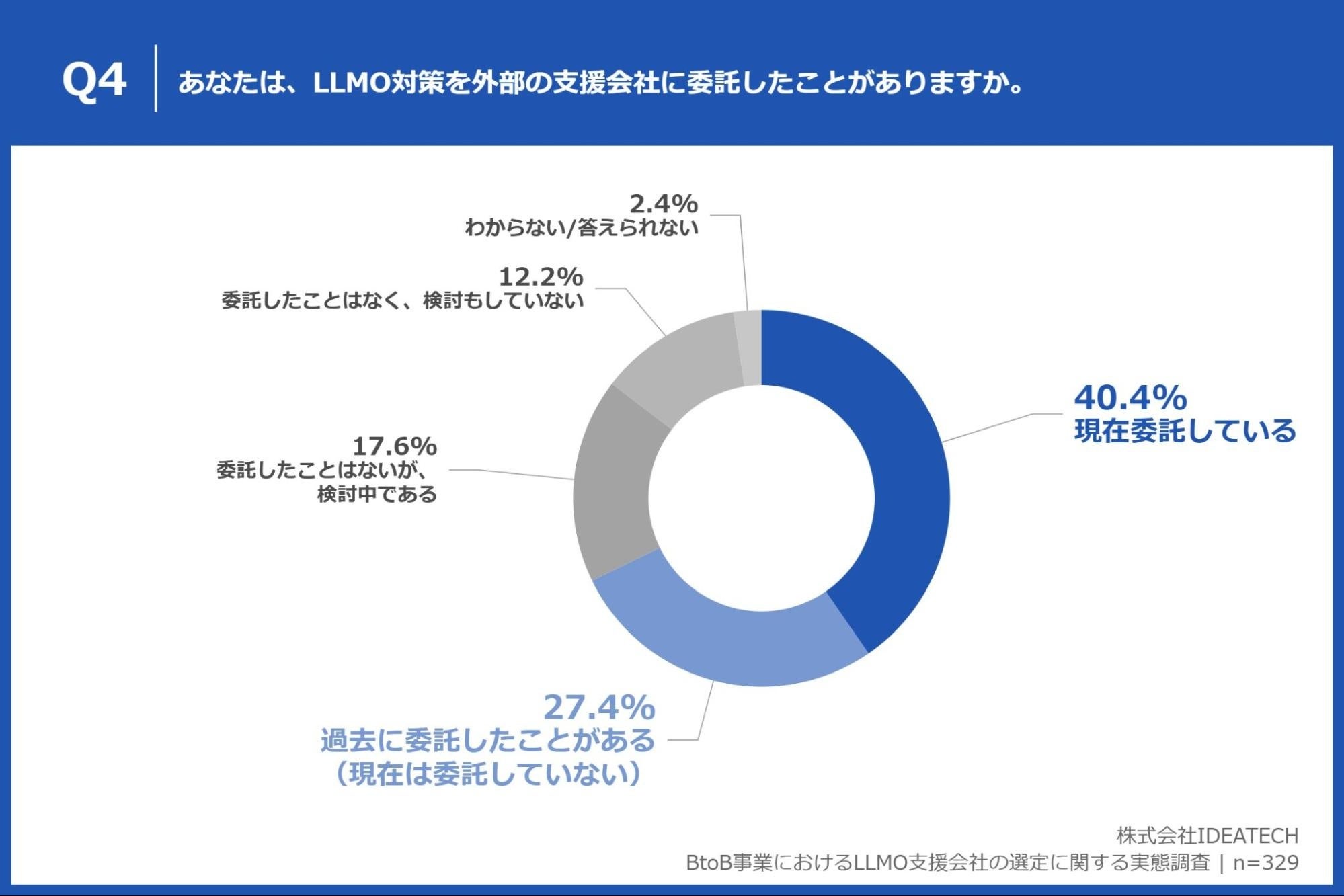 「Q4. あなたは、LLMO対策を外部の支援会社に委託したことがありますか。」(n=329)と質問したところ、「現在委託している」が40.4%、「過去に委託したことがある(現在は委託していない)」が27.4%という回答となりました。