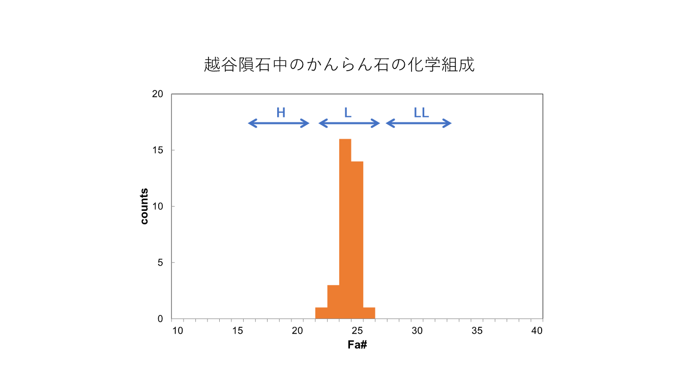 国立極地研究所にて主資料(重さ4.05kg)から保存・分析用試料約120gを切り取り、その内の約2gの小片から研磨薄片と電子顕微鏡用試料の作製を行いました。光学顕微鏡や電子顕微鏡による隕石組織の観察と鉱物組成の分析結果(かんらん石、輝石)から、越谷隕石は普通コンドライト(球粒隕石)に分類されました。普通コンドライトにはH, L, LLの3つの化学的グループがありますが、詳細な鉱物組成からLグループであることが分かりました。また、隕石組織の観察で比較的よく球粒組織が残って見られることから、岩石学的タイプは4であることが分かりました。この組み合わせは「L4コンドライト」と呼ばれます。Lグループはコンドライトで最多のグループですが、L4はその中で1割弱程度と少なく、日本に落下した隕石では福富隕石(1882年落下)がL4とL5の混合タイプであること以外は知られていません。このタイプの隕石は小惑星が起源となります。