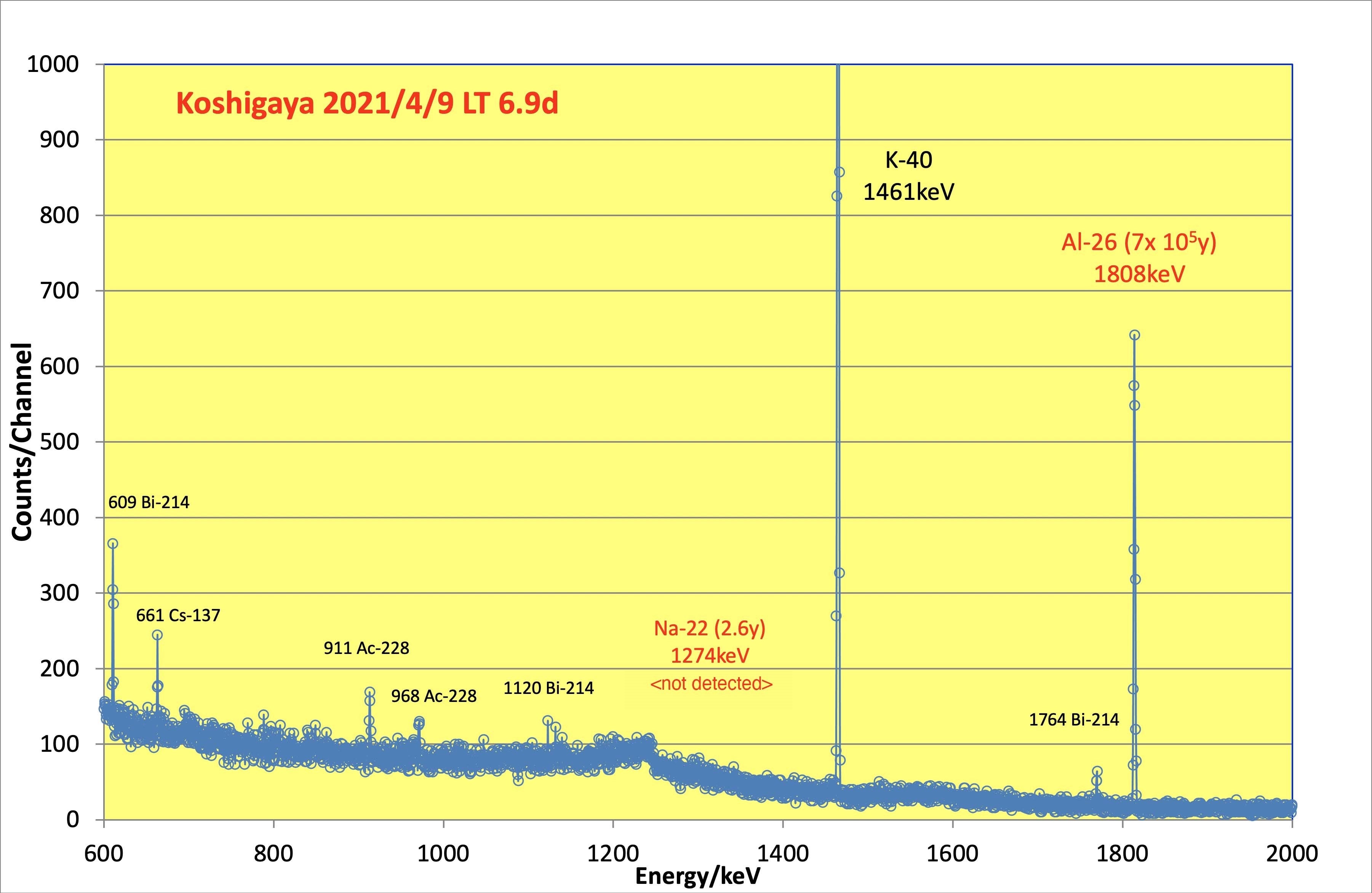 1902(明治35)年3月8日の明け方に火山の噴火したような音がして、埼玉県南埼玉郡桜井村大字大里(現在の越谷市)の中村喜八氏の田畑に大きな穴ができ、1m余りの底から隕石が発見されました(東京朝日新聞 明治35年4月25日付け記事)。回収された隕石は1個で重量は4.05kgでした。中村家に長年保管されてきましたが、2021年に越谷市郷土研究会を通じて国立科学博物館に成分分析の依頼がありました。ガンマ線測定の結果、宇宙線により生成する放射性核種(宇宙線生成核種)のアルミニウム-26(半減期約70万年)が検出され隕石であることが確認されました。また、同じく宇宙線生成核種で半減期が約2.6年のナトリウム-22は検出されず、落下してからナトリウム-22が壊変しつくしてしまう程度の期間、少なくとも数十年前に落下した隕石であることも分かり、落下日の記録と整合的であることが確認されました。