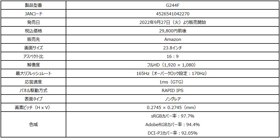 RAPID IPSパネル搭載 高画質・高速応答対応ゲーミングモニター リフレッシュレート170Hz・応答速度1ms(GTG)の高スペックモデル 「G244F」発売