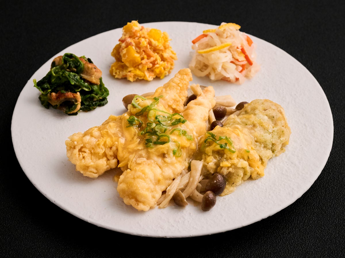 この度、海老の天ぷらと竹輪の磯辺天に、牡蠣醤油を使用した特製の旨みたっぷりの卵あんをかけた、贅沢なメニューが新登場します。だしの旨みを感じる、優しいとろみの卵あんと天ぷらは相性抜群で、これまでにはない和の逸品に仕上げています。