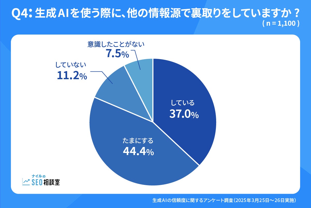 「生成AIの回答を他の情報源で裏取りしている」と明確に答えた人は37.0%、さらに「たまにする」と答えた人も44.4%にのぼり、実に8割以上のユーザーが何らかの形で裏取りを行っていることがわかりました。
