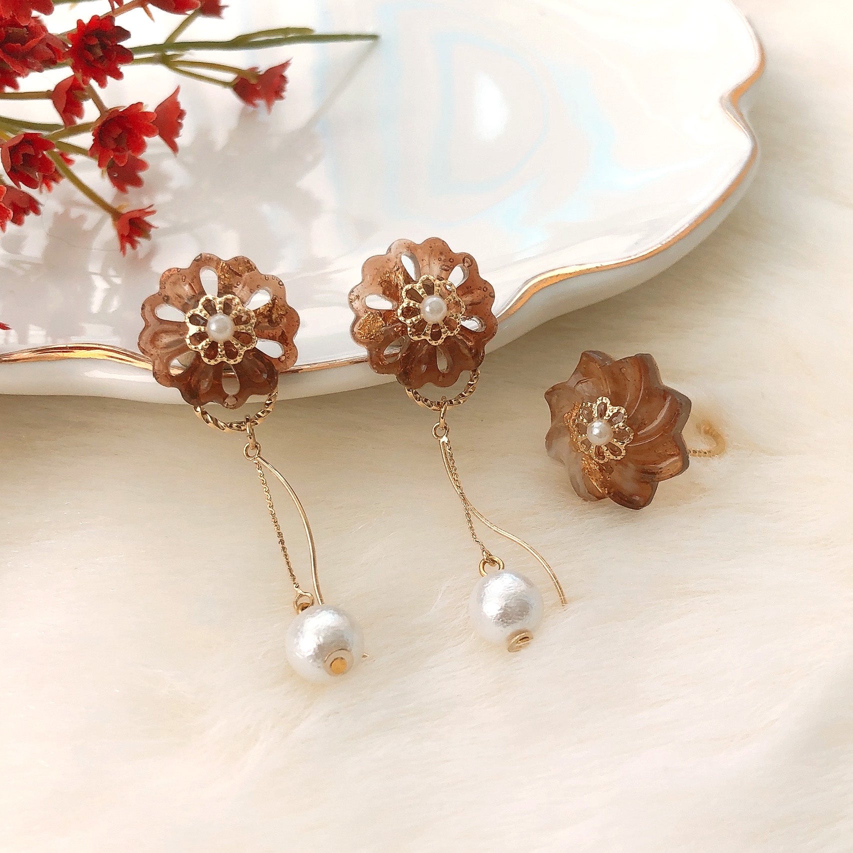 フープを重ね、パールとガラスをあしらった華やかなイヤリングは、ゆらゆらと煌めくアクセサリーが一気にお顔周りを明るくしてくれます。