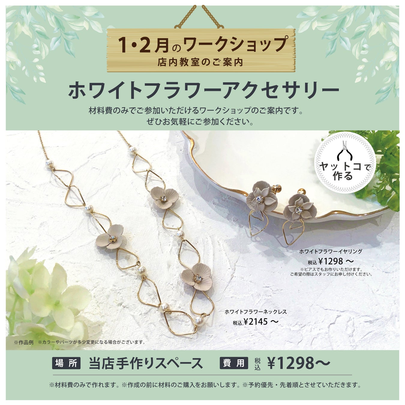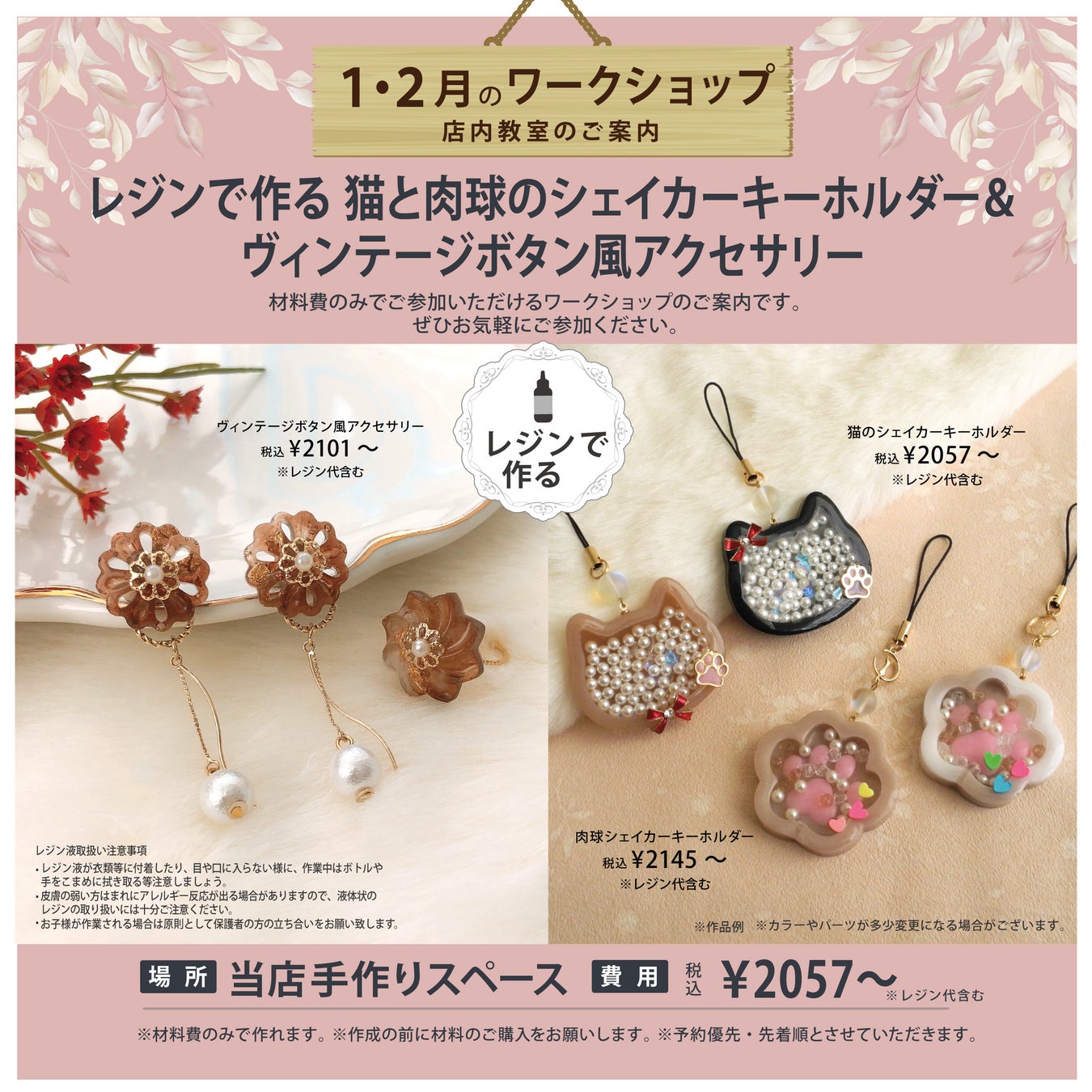 材料費だけで参加できる「ワークショップ」2024年1月2月は、ホワイトフラワーアクセサリーとレジンで作る ヴィンテージボタン風アクセサリー&猫と肉球のシェイカーキーホルダー