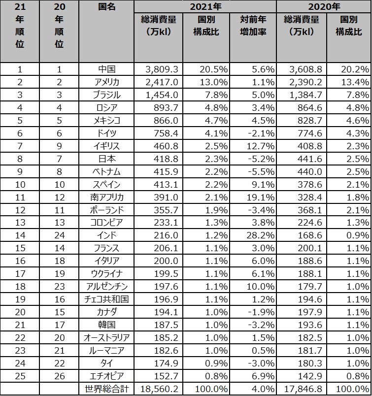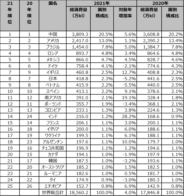 ・上位10か国でコロナ禍前の2019年(総消費量:約1億9,020万kl)と比較すると、アメリカ(19年比1.5%増)、ブラジル(19年比9.5%増)、ロシア(19年比7.6%増)がプラスで着地した。