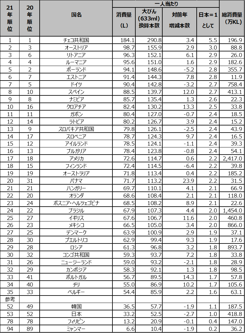 2021年 国別ビール消費量