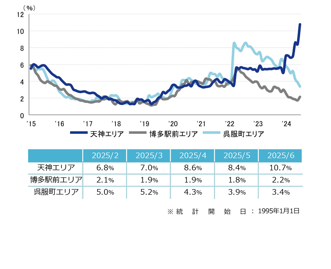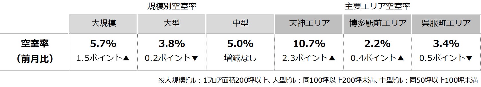 空室率は前月比プラス0.74ポイントの5.21%と前月から大幅に上昇し、2023年7月以来の5%台となった。複数の新築ビルが空室を抱えて竣工し主な上昇要因となっているが、契約手続き中のテナントも多く、今後は空室消化が進むとみられる。エリア別では「天神」が前月比プラス2.3ポイントの大幅な上昇で10%台となった。潜在空室率は前月比プラス0.56ポイントの6.74%だった。