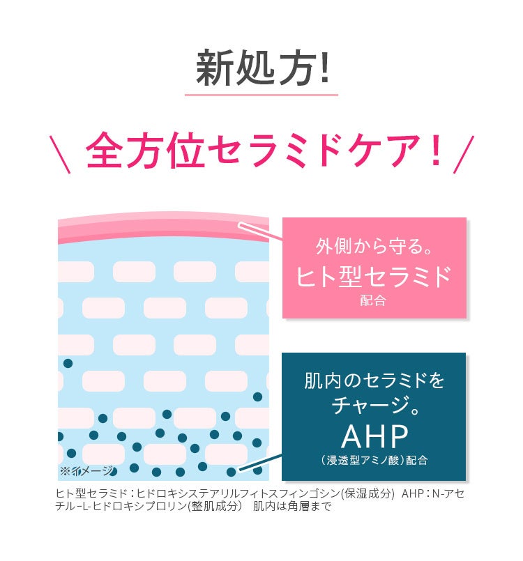 ①皮膚科学の研究の知見から「AHP(浸透型アミノ酸)」を新配合。「AHP」を含む”全方位セラミドケア”でバリア機能をサポート。