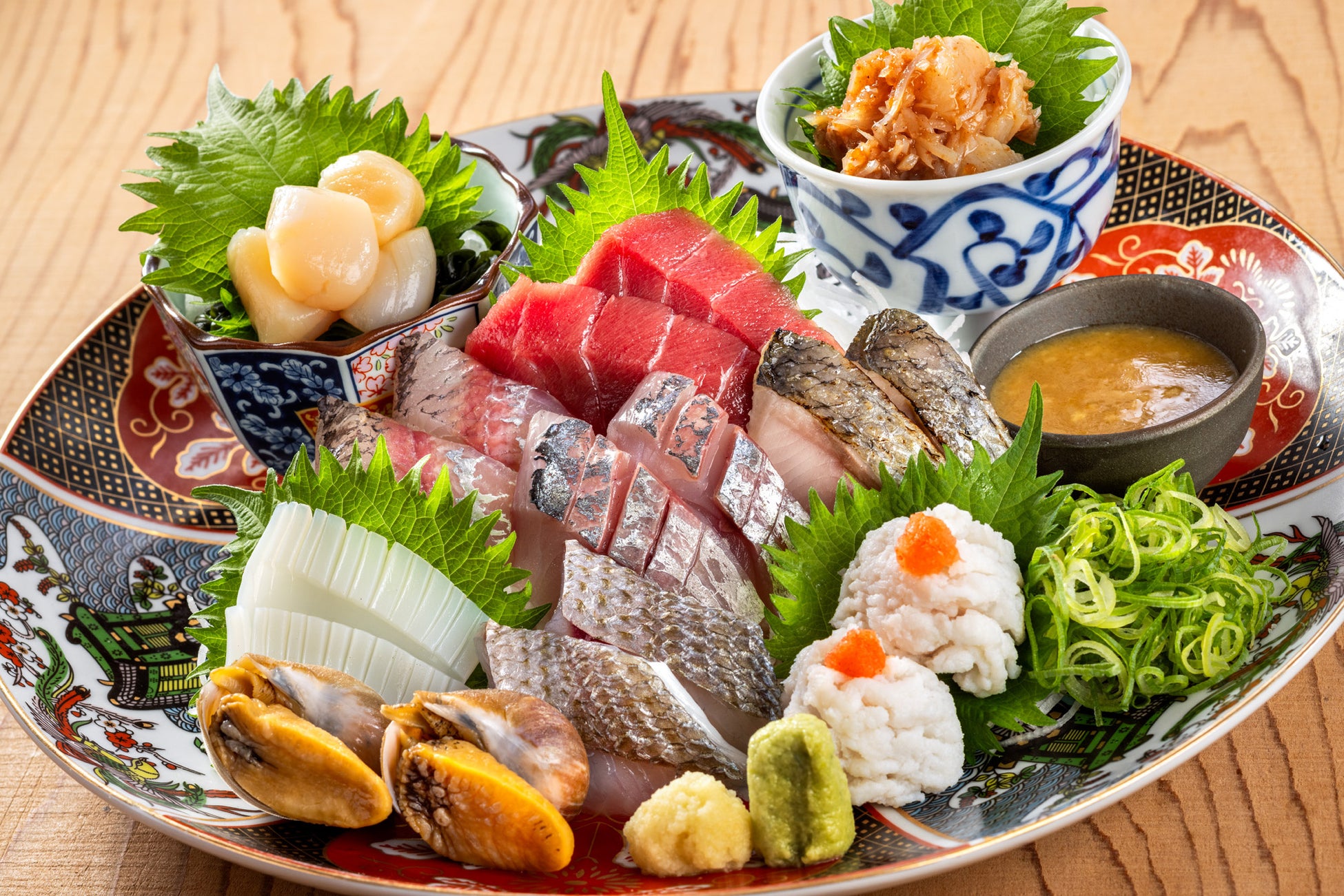 四十八漁場の看板メニュー、刺身盛り合わせの四国フェアバージョンは、高知県須崎市の【九石大敷】から届く旬の魚貝を中心、徳島のスミイカなど、この時期ならではの味わいが並びます。