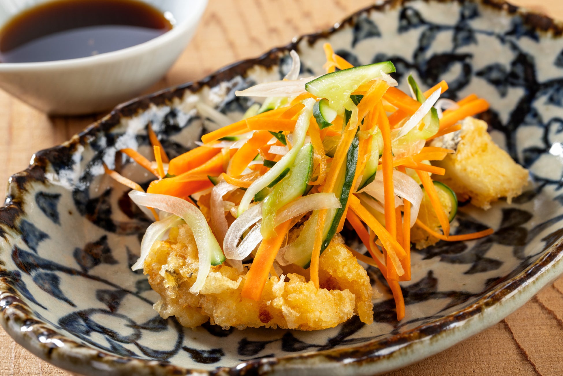 揚げたての天ぷらにシャキシャキ野菜を乗せ、召し上がる直前に特製の南蛮ダレで仕上げます。