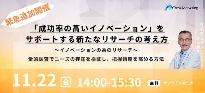 株式会社クロス・マーケティング(本社:東京都新宿区 代表取締役社長兼CEO:五十嵐 幹、以下当社)は、成功率の高いイノベーションをサポートする新たなリサーチの考え方「イノベーションの為のリサーチ 量的調査でニーズの存在を検証し、把握精度を高める方法」セミナーを11月22日(金)に開催いたします。