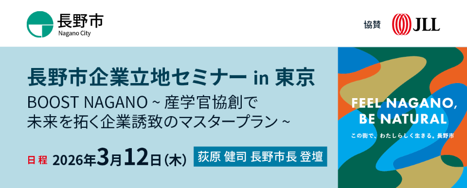 東京 2026年2月18日 – 総合不動産サービス大手JLL(本社:東京都千代田区、代表取締役社長:河西 利信)は、2026年3月12日(木)に、長野市主催、JLL協賛の企業誘致セミナー「長野市企業立地セミナーin東京 BOOST NAGANO ~ 産学官協創で未来を拓く企業誘致のマスタープラン ~」をJLL日本本社(東京ガーデンテラス紀尾井町 紀尾井タワー)にて開催しますのでお知らせいたします。