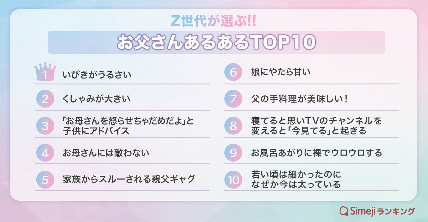 【Simejiランキング】Z世代が選ぶ!!「お父さんあるあるTOP10」
